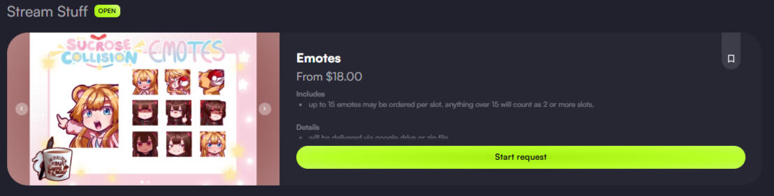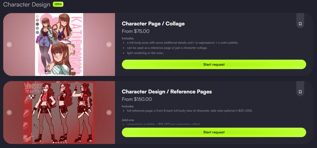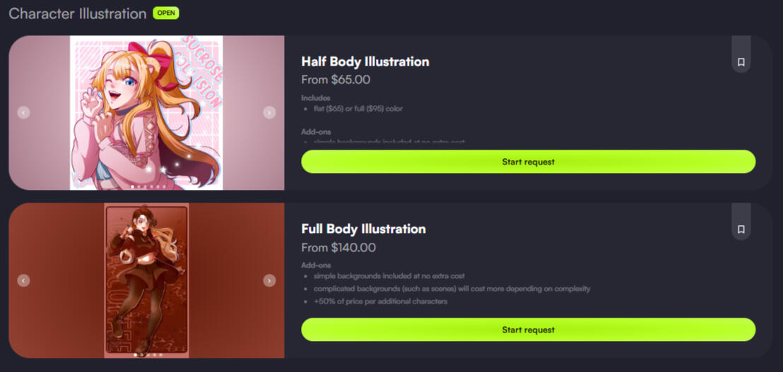 My commission prices & services are updated every so often! The easiest way to keep up with it is to check my VGen, as well as view examples.